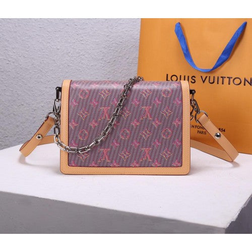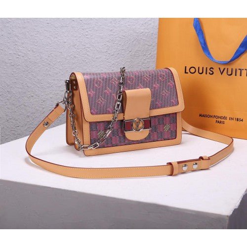 Inspired by a Louis Vuitton bag from the 1970s, the Dauphine MM handbag is made from supple calf leather featuring the Monogram LV Pop print in bright pink. The motif’s neon effect brings an fashionable edge to this retro-chic bag. The pink guilloche engraving on the Dauphine LV lock adds a pop feel.9.84 x 6.69 x 4.13 inches (Length x Height x Width) L 9.8 x H 6.7 x W 4.1 inchesPrinted calf leatherNatural cowhide-leather trim with patina finishMicrofiber liningSilver-color hardware with pink guilloché engravingRemovable and adjustable leather strap (drop: min. 25 cm/9.8 inches, max. 45 cm/17.7 inches) for shoulder or cross-body carryRemovable chain strap (drop: 30 cm / 11.8 inch) for shoulder carryMagnetized front lock2 inside compartments with middle zipped pocketInside back flat pocket