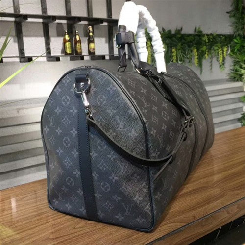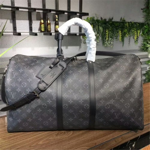The beloved Keepall 55 Bandouliere now comes in our new iconic black and grey Monogram Eclipse canvas. Light, supple and always ready for immediate departure, the bag lives up to its name: those adept at the art of packing can easily fit a week's wardrobe into the generously sized (and cabin-friendly) Keepall 55.