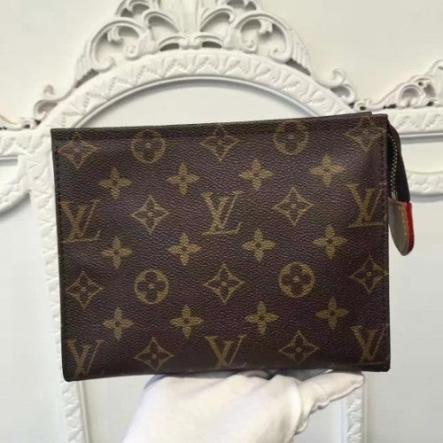 The mid-sized toiletry pouch in Monogram canvas features a washable lining and slips easily into a handbag.
