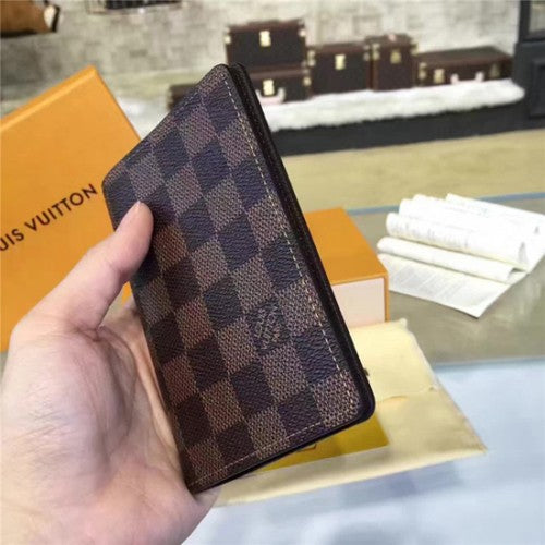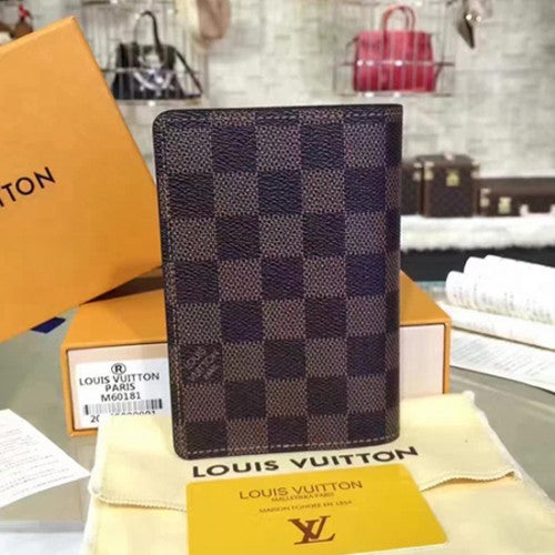 This passport holder in Damier canvas features various compartments to hold business cards and papers.