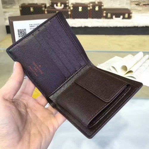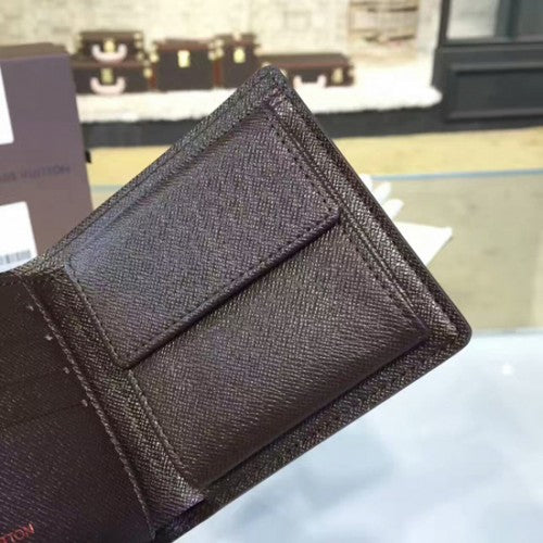This wallet in Damier canvas features a snap-closure coin pocket. It also features three credit card slots and three pockets.