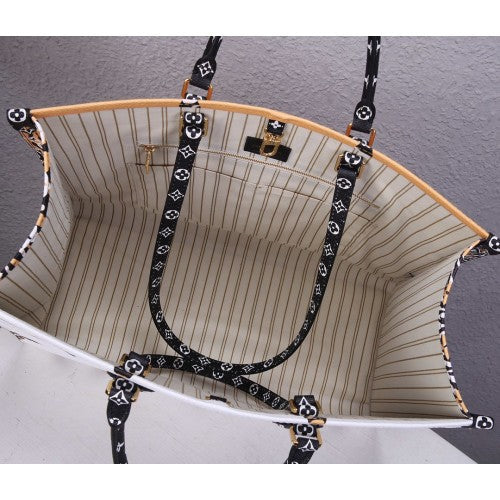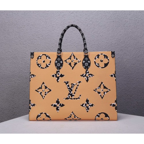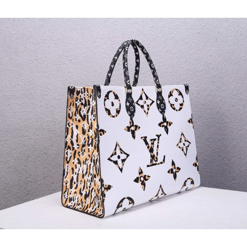 The Onthego tote bag takes on a bold new look in coated canvas with a print combining multiple sizes of the Monogram motif with leopard and zebra skin patterns. Its generous capacity, removable shoulder straps, and top handles make the Onthego perfect for everyday use.